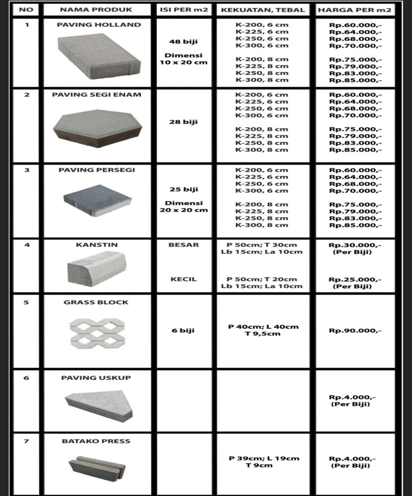 Daftar Conblock K300 Per M2